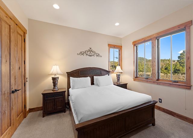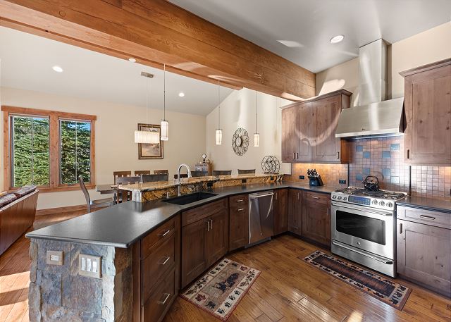 The full-sized kitchen is stocked with all the essential cookware and tableware to make a meal away from home and has custom cabinetry, granite countertops and stainless steel appliances. The dining area seats six comfortably with four additional seats at the breakfast bar. You can also dine outside with ample patio seating and spectacular mountain views and star gazing.