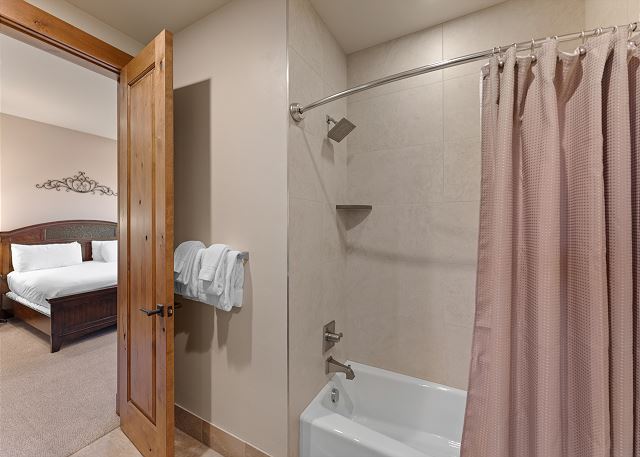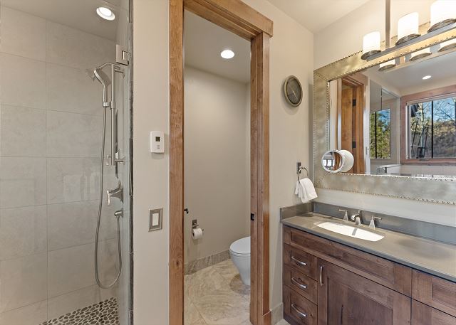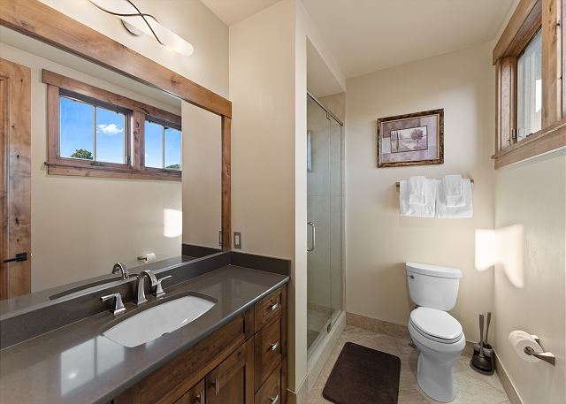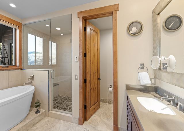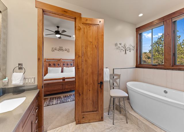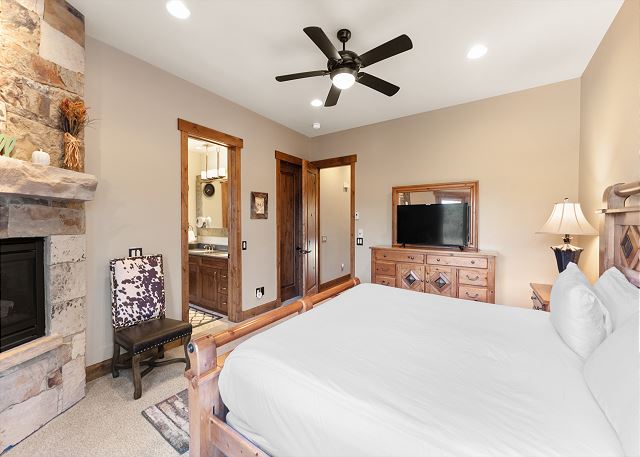 The primary suite is on the main level. It features a king-sized bed, a smart TV, and it's own fireplace and patio for relaxing evenings. The en suite bathroom has double sinks, soaking tub, and walk-in shower with a door separating the toilet area for added privacy. You also have access to a washer and dryer located on the main level. For your convenience, laundry detergent is provided.