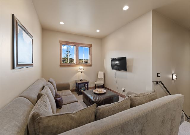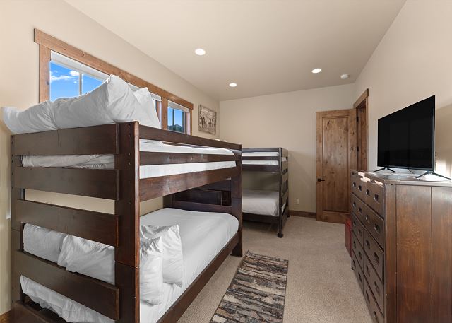 Head upstairs to the sitting area, which features a large sectional sofa, a smart TV, and access to the first guest bathroom. Also upstairs are both guest bedrooms. The first guest bedroom features a king bed, a smart TV, and private access to the first guest bathroom. The bathroom door to the sitting area can be locked from the inside, creating a second primary suite. The second guest bedroom has two full-over-full bunk beds, a smart TV, and an en-suite bathroom.