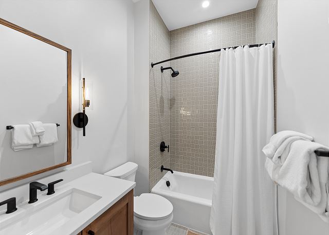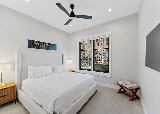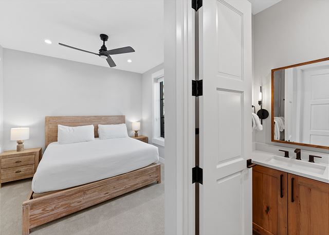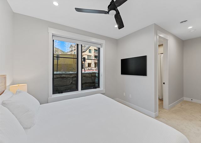 The entry level features garage access, half bathroom, a washer and dryer, and a bedroom with a king bed, mounted TV, and en suite bathroom with a shower/tub combination—perfect for guests seeking convenience and privacy.