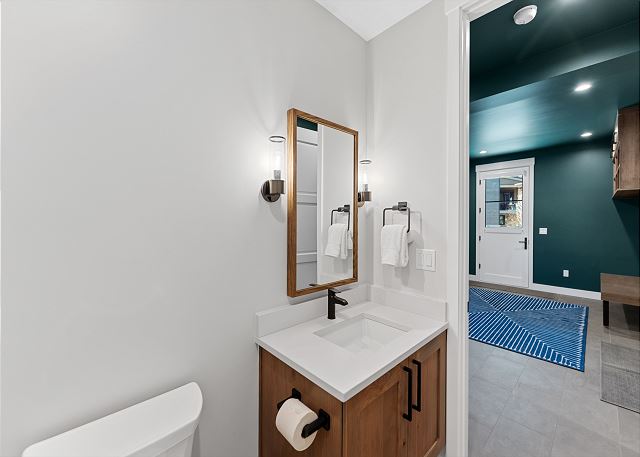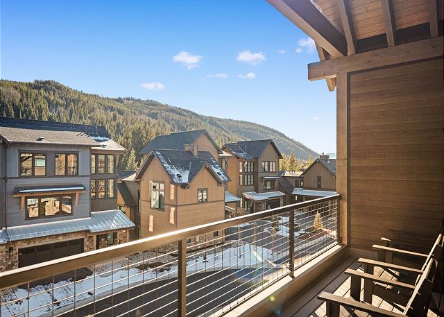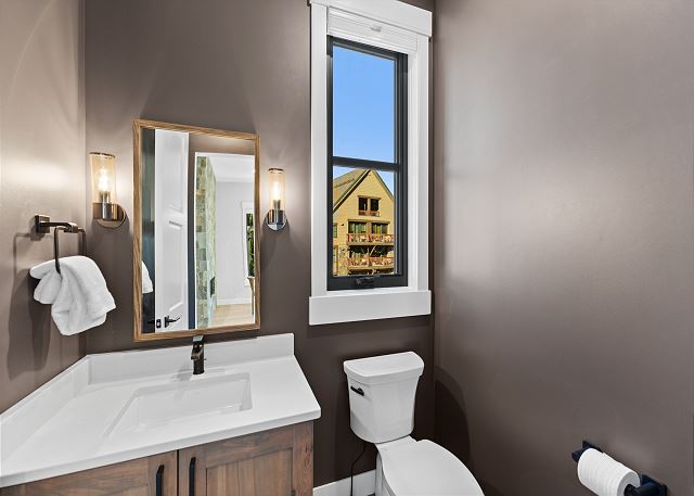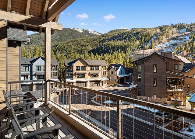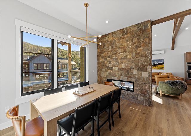 The top floor boasts an open-concept living space with vaulted ceilings, a cozy fireplace, smart TV, air conditioning, and ample seating—perfect for gathering after a day on the mountain. The kitchen is equipped with stainless steel appliances, including a double oven, and a breakfast bar with seating for four. The dining area seats up to eight. Step out onto the private balcony to enjoy outdoor seating and beautiful ski slope views. A half bathroom is located near the stairs.
