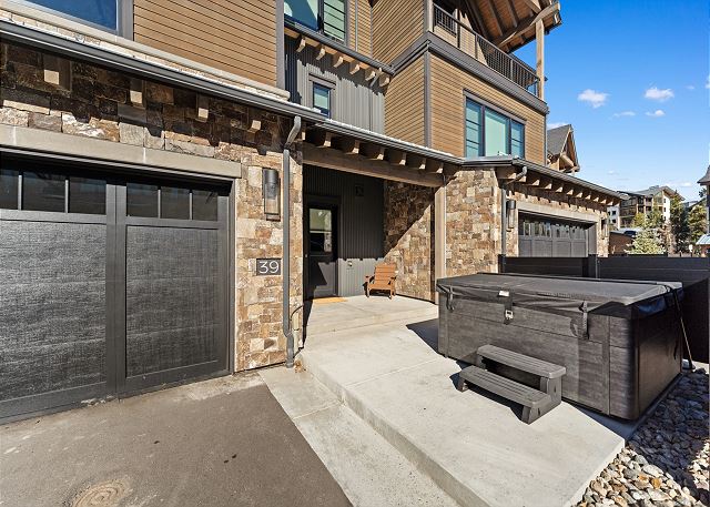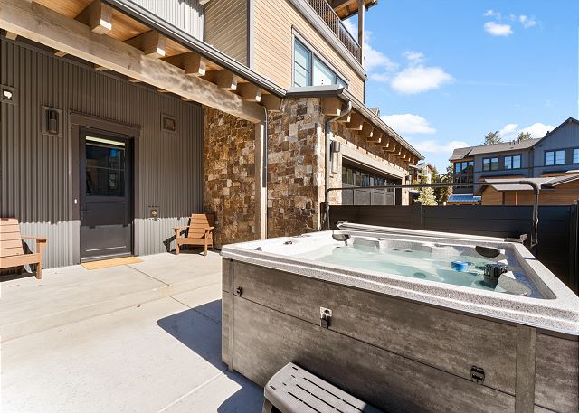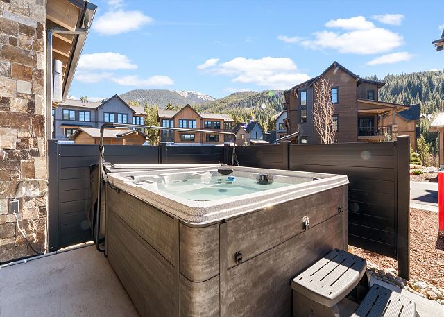 Guests can unwind in the private outdoor freshwater hot tub on the ground-level terrace or take a short 2–3 minute walk to enjoy the Dakota Lodge heated pool and hot tubs.