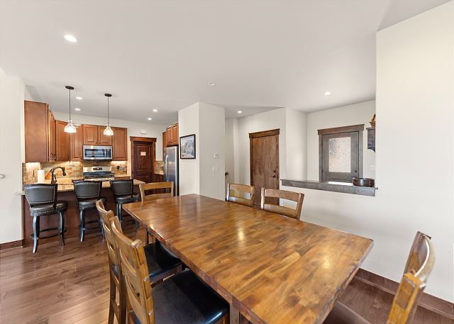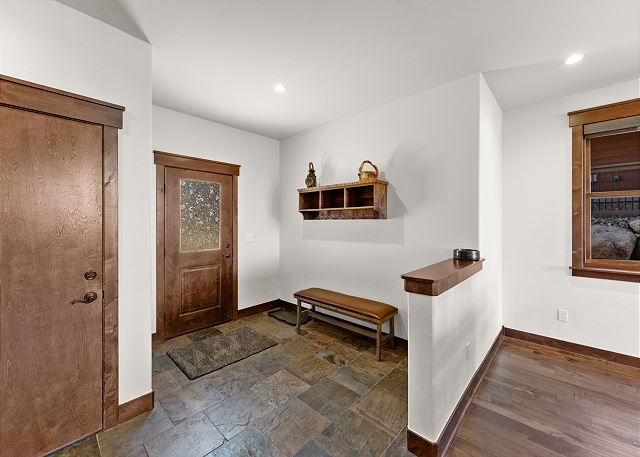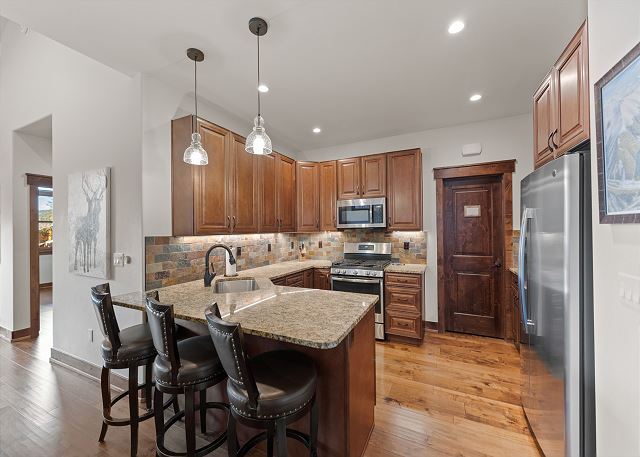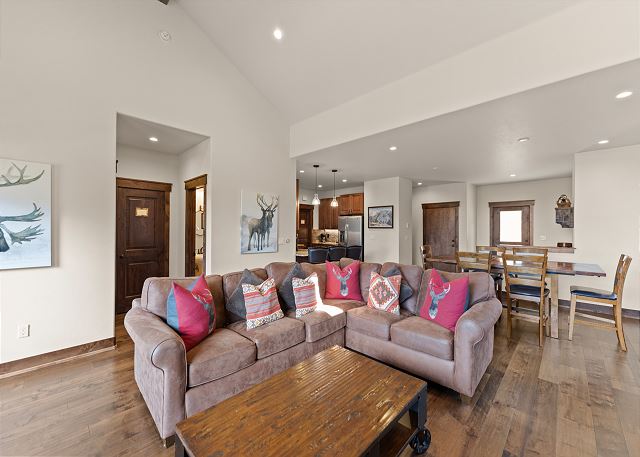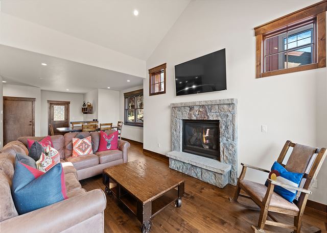 The entryway offers a bench for your convenience while coming and going throughout the day. The living area features vaulted ceilings and a cozy sectional. There's a flat screen TV above a beautiful gas fireplace with stone surround. Just off the living area is access to the private deck with beautiful mountain views. Sit back and enjoy the fresh mountain air with a cup of coffee or a glass of wine.