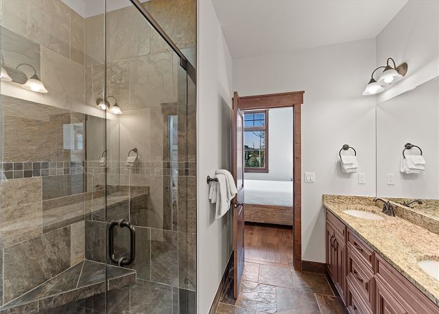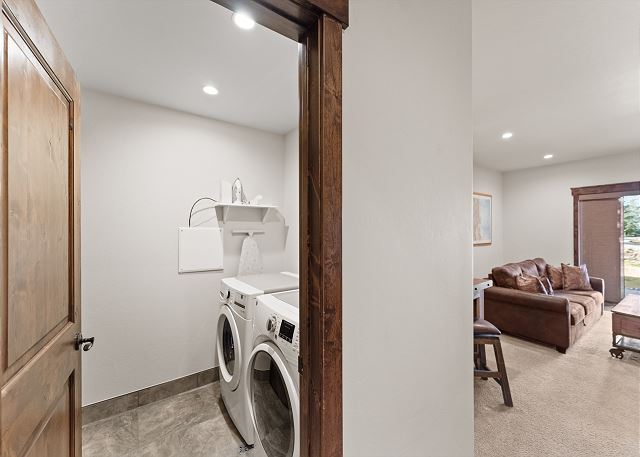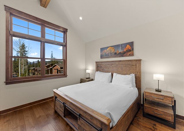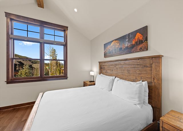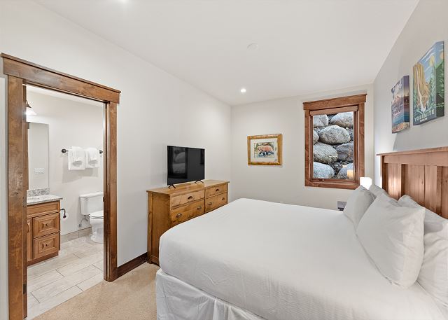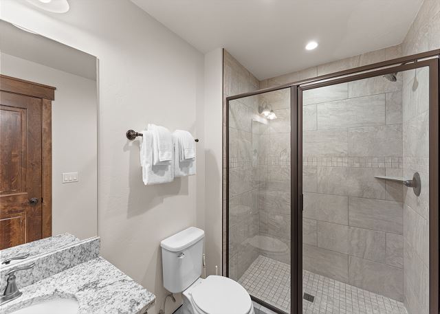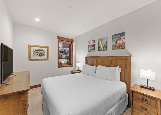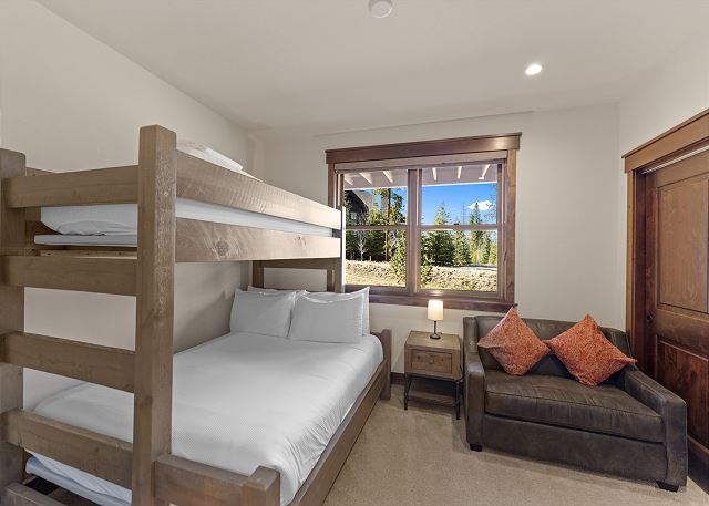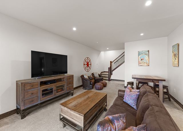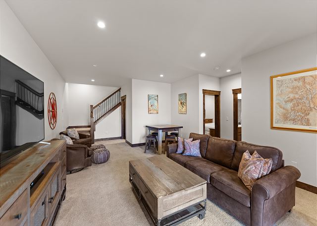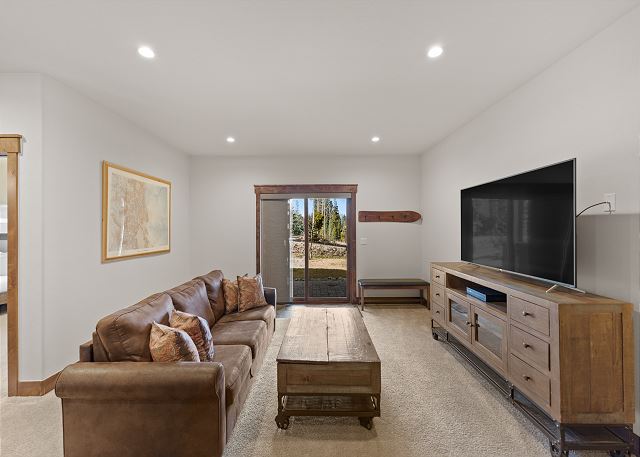 Downstairs are two more bedrooms and a family room. The family room has a flat screen TV and there is a queen-sized sleeper sofa. Additional sheets and blankets are in a closet. There is a game table with stools and the homeowner has provided a selection of board games for your enjoyment. Take advantage of the walk-out patio with beautiful views and access to a trail that will bring you to the River Run gondola.
