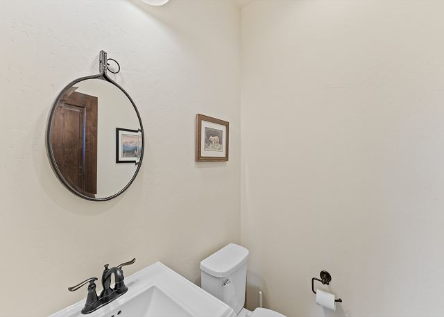 The full-sized kitchen is stocked with all the essential cookware and tableware to make a meal away from home and features custom cabinetry, stainless steel appliances and granite countertops. The dining area seats six with three additional seats at the breakfast bar. There is a half bath on this main level. All bathrooms are stocked with towels and an initial supply of toiletries.