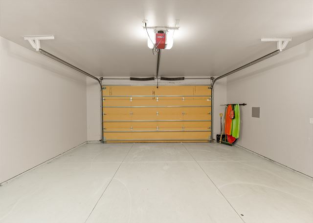 The second primary bedroom features a king-sized bed with Ivory White Bedding and a new high-end mattress and a Smart TV. The en suite bathroom has a single sink vanity and a walk-in shower with tile surround. The guest bedroom has a twin-over-full bunk bed and a twin-sized sleeper chair. Additional sheets and blankets are in a closet. This bedroom also has its own entrance to the guest bathroom that has double sinks with granite countertops and a shower/tub combination. Also downstairs is a laundry room with a new full-size washer and dryer. Detergent has been provided for your convenience. The private heated two-car garage offers additional storage for vacation gear.