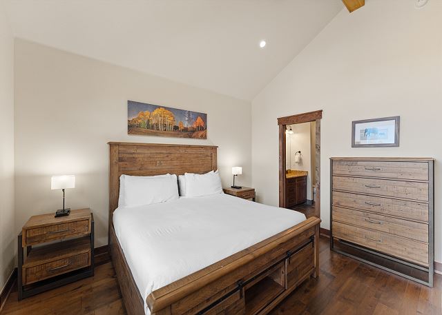 The primary bedroom is also on the main level. It features a king-sized bed with Ivory White Bedding and a new high-end mattress and a Smart TV. The en suite bathroom has double sinks with granite countertops and a walk-in shower with tile surround and a bench.
