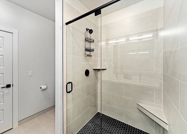 · Primary Suite: King bed with a Purple RestorePremier® Hybrid Mattress, flat-screen TV, and a spa-like en suite featuring a spacious walk-in shower with built-in bench and dual-sink vanity.