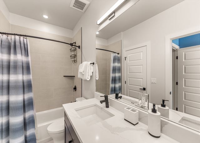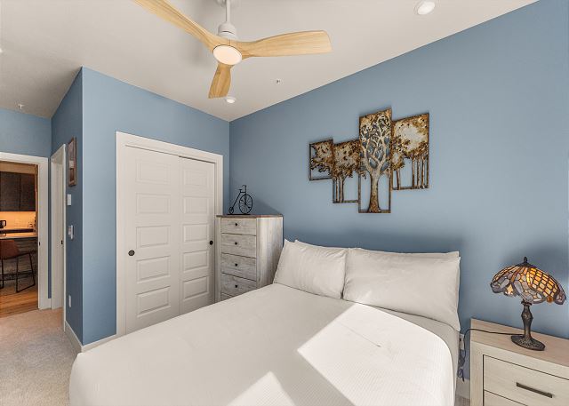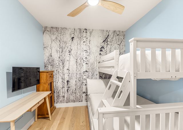 · Third Bedroom: The third guest bedroom is perfect for families or kids, featuring a twin-over-queen bunk bed with a twin trundle below, plus its own TV for late-night movies or gaming. The room also features a desk with HDMI connectivity to the TV, ideal for remote work.
