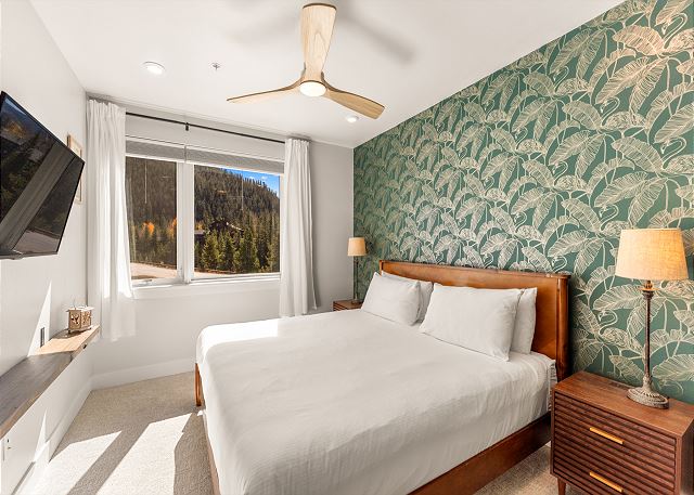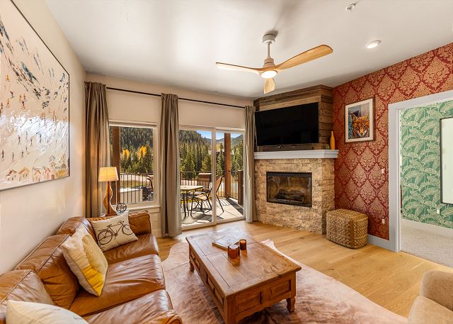 Step into the open-concept living area, where a cozy fireplace, plush seating, and a wall-mounted smart TV invite you to unwind after a day on the mountain. Sliding glass doors lead to your private balcony, perfect for morning coffee or an après-ski drink with fresh alpine air and mountain views.