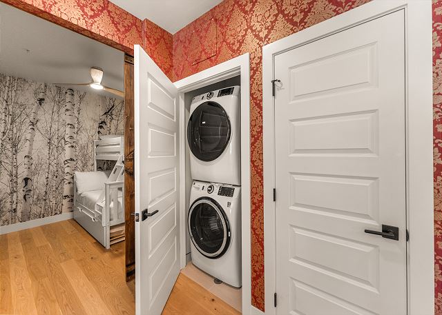 The full kitchen is equipped with sleek stainless steel appliances and everything you need to cook up a hearty breakfast or dinner after a day of exploring. Casual meals are a breeze at the breakfast bar with seating for four, while more formal gatherings can take place at the dining table that comfortably seats 6–8 guests. For your convenience, a washer and dryer are tucked away in a closet near the dining area, making longer stays even easier.