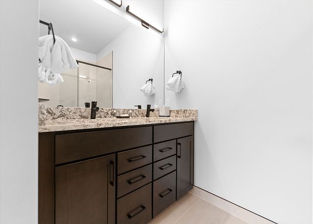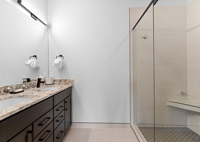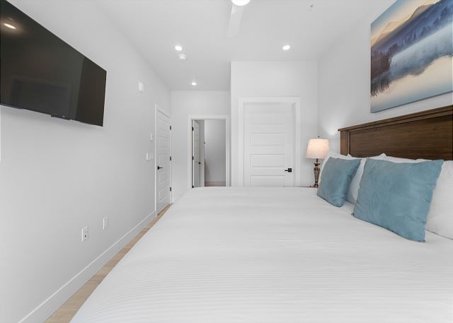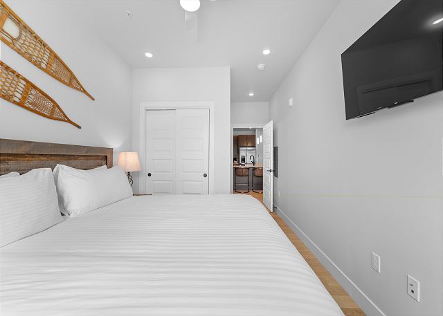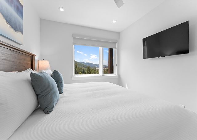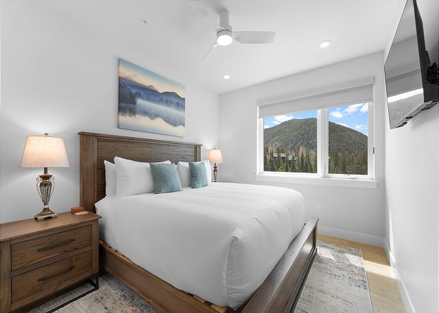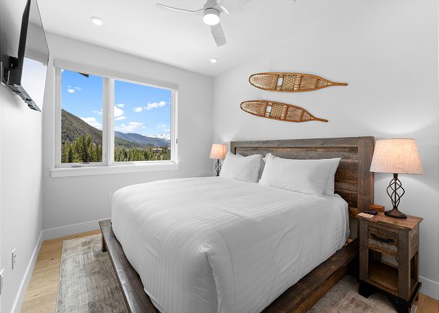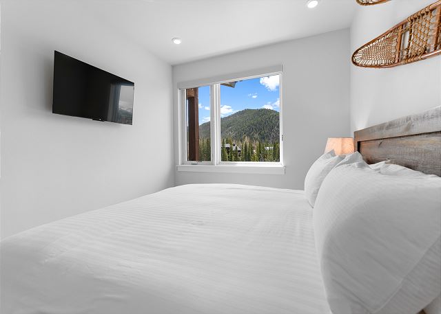 The primary bedroom on the main level offers a king-size bed, a mounted TV, sweeping mountain views, and an en-suite bathroom with a dual-sink vanity and walk-in shower. The second bedroom also boasts a king-size bed, TV and mountain vistas, with direct access to the guest bathroom, which includes an additional entry from the living area.