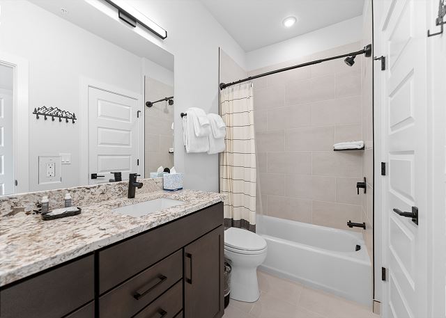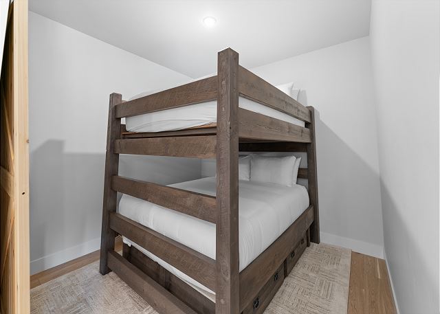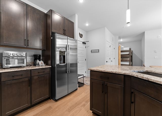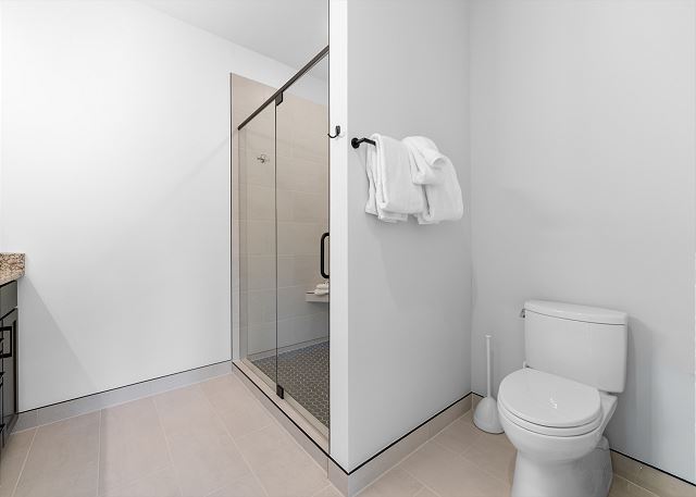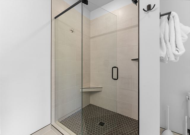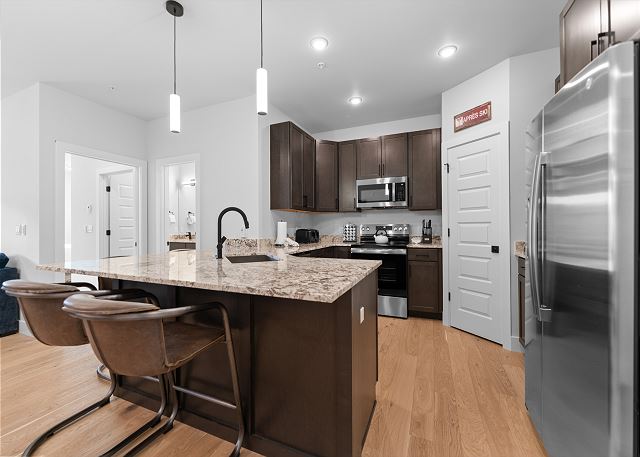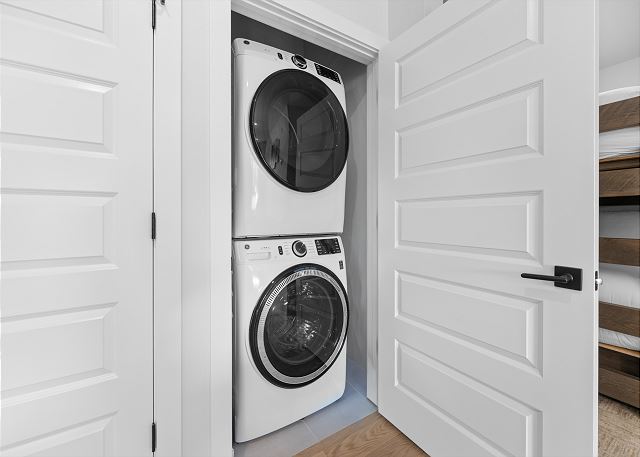 Additional sleeping space can be found in the den just off the dining area, providing a queen-over-queen bunk bed with barn doors for additional privacy. A stacked washer-dryer unit tucked in the entryway closet, with an initial supply of detergent provided, makes longer stays hassle-free.