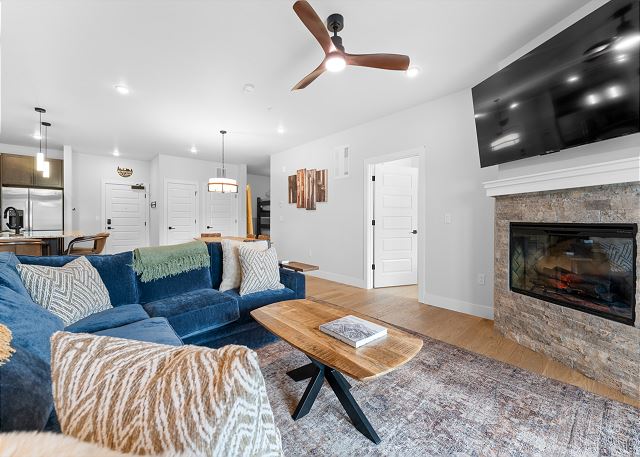 The open-concept living area centers on a programmable electric fireplace—choose your preferred color and temperature—and a queen-sleeper sofa, all opening onto a private balcony where you can soak in the surrounding peaks.