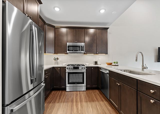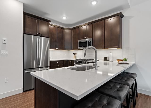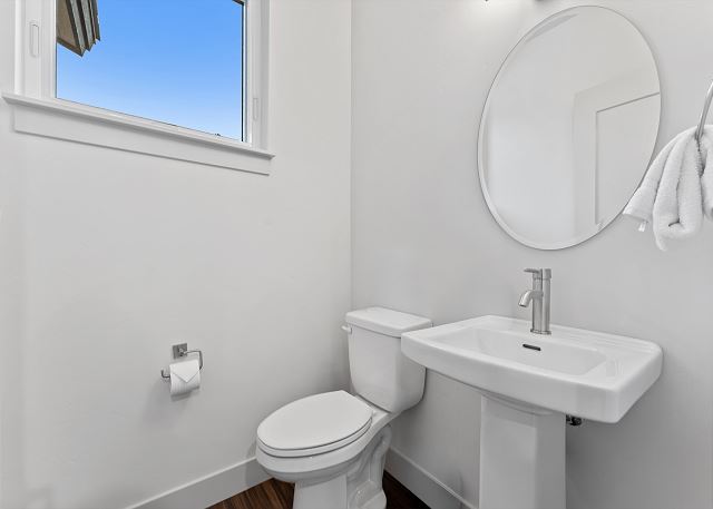 The fully stocked kitchen includes stainless steel appliances and all the cookware you need to prepare meals at home. There is a breakfast bar for casual dining and a dining table for sit-down meals together. A half bathroom is conveniently located just off the kitchen.