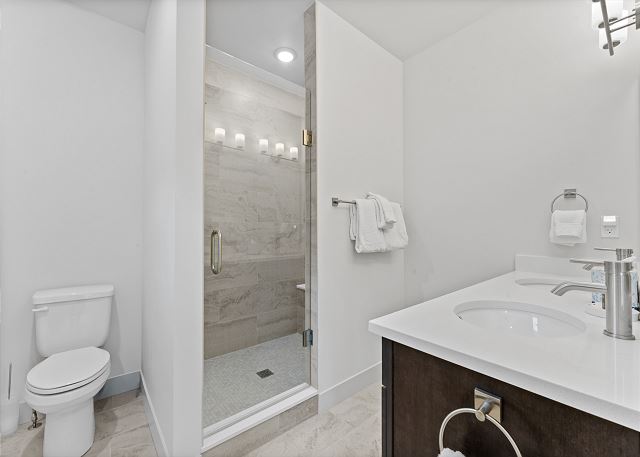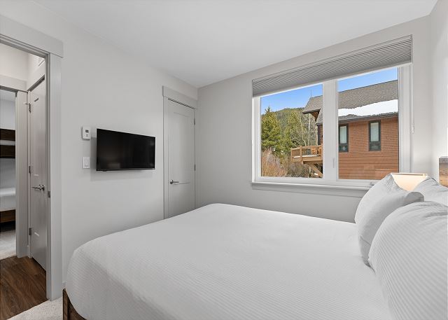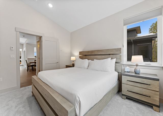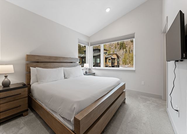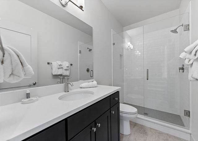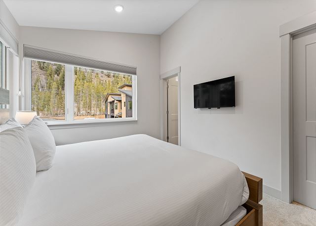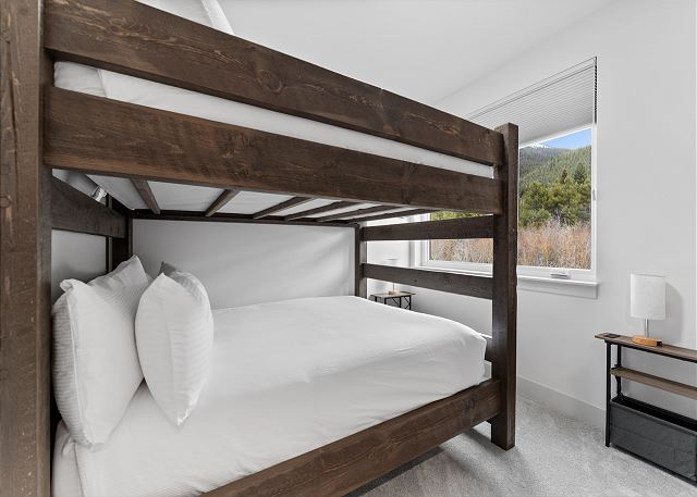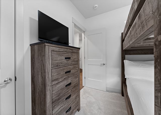 The primary bedroom, located on the main level, includes a king bed, a mounted smart TV, and a private bathroom with dual sinks and a walk-in shower. Head back down to the ground level to find the remaining bedrooms. The first guest bedroom features a queen bed, a TV, and closet space for your belongings. The second bedroom offers a queen over queen bunk bed, along with a TV and closet space, making it a great option for kids or additional guests.