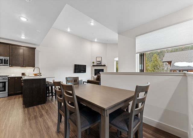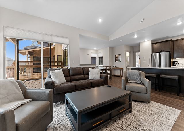 The main level features an open living space with vaulted ceilings and great natural light. The living room offers a cozy gas fireplace, a mounted smart TV, and a queen sleeper sofa for additional sleeping space. Step out onto the private balcony to enjoy your private saltwater hot tub with a mountain view.