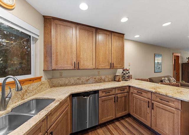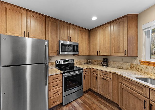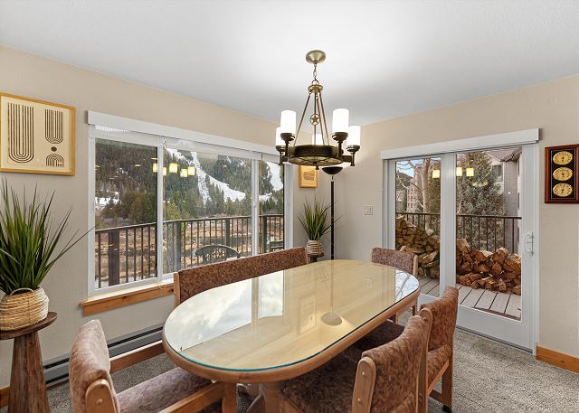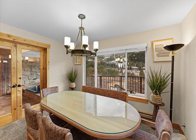 The fully equipped kitchen features stainless steel appliances, plenty of counter space, and a breakfast bar with seating for two. Whether you're whipping up a quick snack or preparing a family meal, the kitchen is stocked with all essential cookware and utensils. Gather at the dining table, where large windows frame scenic mountain views to enhance every meal.