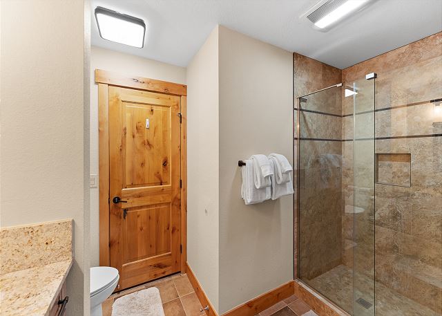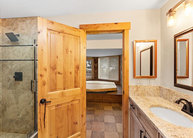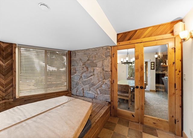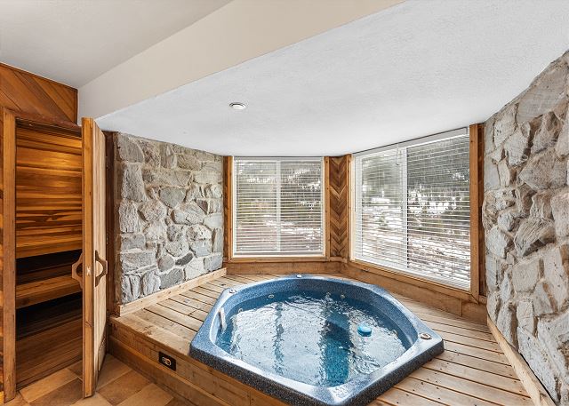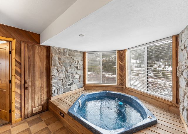 One of this home's most unique highlights is the private indoor hot tub and sauna, located just off the living room. Unwind with a soothing soak while gazing out at the slopes, or step into the sauna for a relaxing retreat. This area also includes a connected bathroom with a walk-in shower for added convenience.