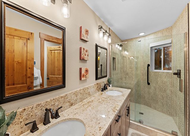 The primary bedroom is a peaceful haven offering a king bed, twin daybed with trundle, an en suite bathroom with a walk-in shower, and direct access to the private hot tub and sauna room. The guest bedroom provides a queen bed and twin bunk bed, creating flexible sleeping arrangements for all types of travelers.