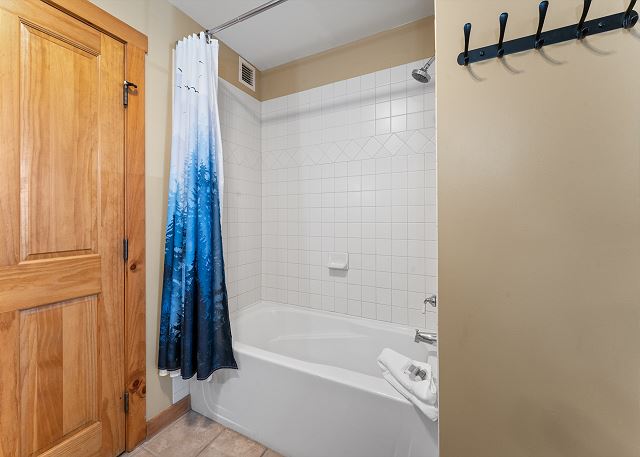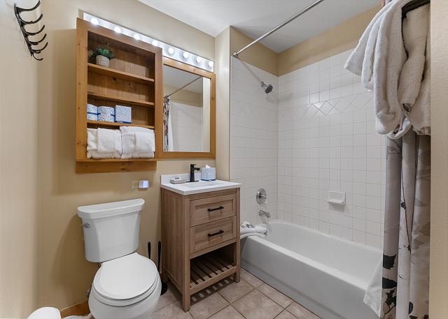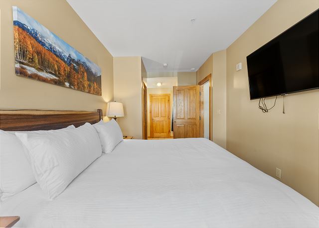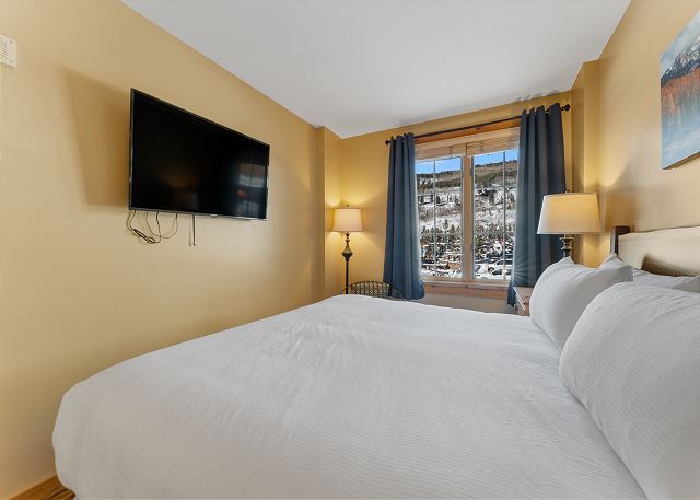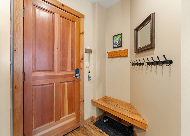 The entryway welcomes you with convenient hooks and a bench, perfect for gearing up before heading out or dropping ski gear after a day on the slopes. The cozy living room features a warm gas fireplace, a mounted TV, and a comfortable queen sleeper sofa. Step outside onto the private balcony to take in views of the surrounding mountains and Dercum Square, where you can watch ice skaters glide across the rink in winter or enjoy the lively mini golf course during the summer months.