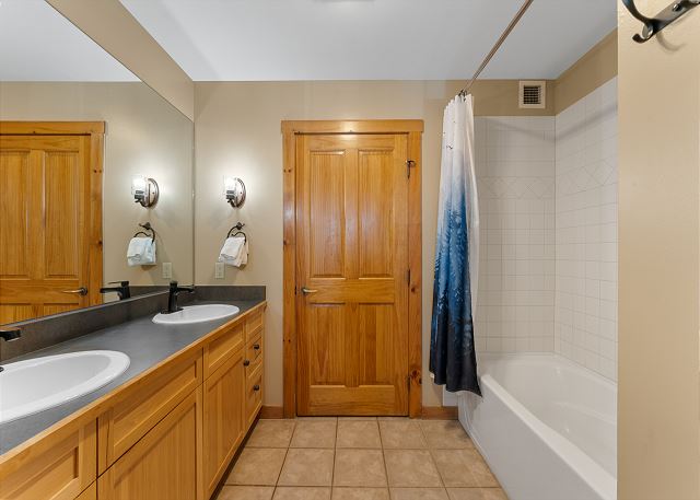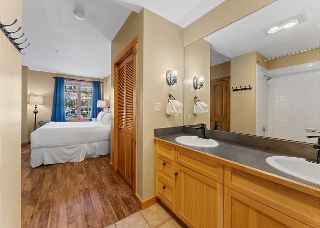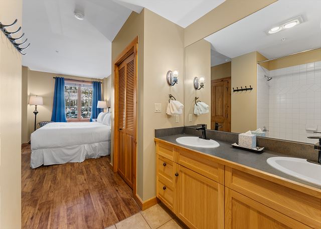 The primary bedroom offers a comfortable king bed, a mounted TV, and a spacious en suite bathroom with a dual-sink vanity and a separate water closet for added privacy. The guest bedroom features a queen bed and TV, with the second full bathroom conveniently located just off the entryway.