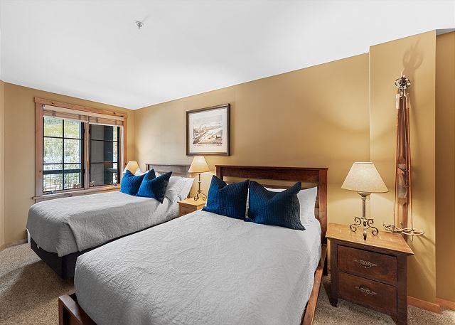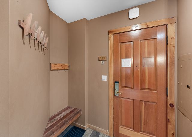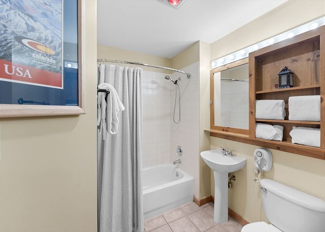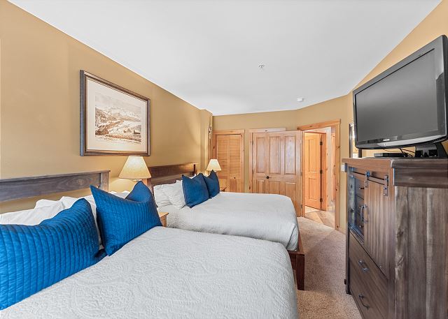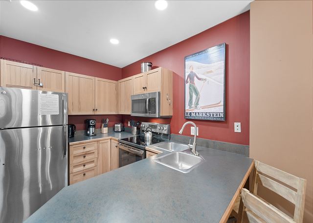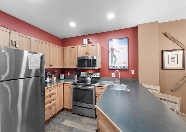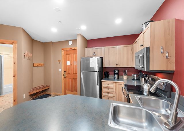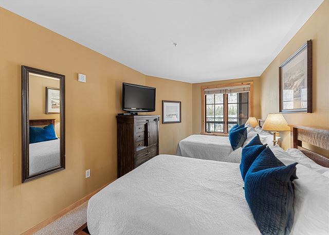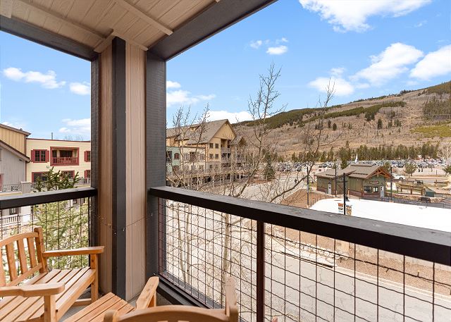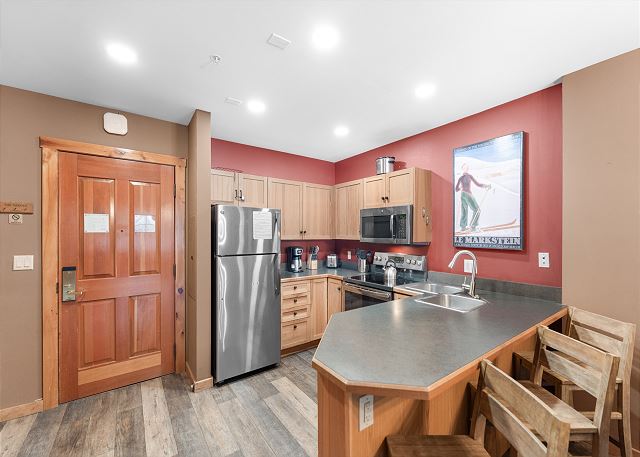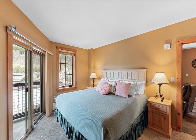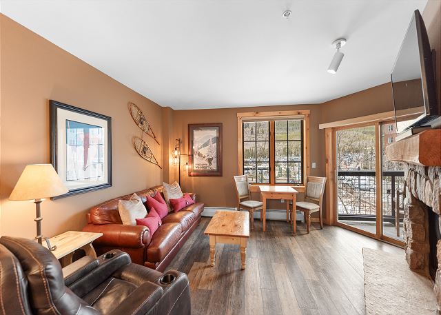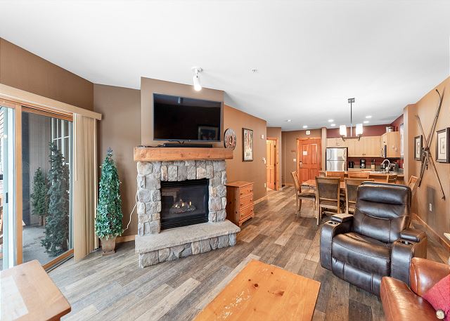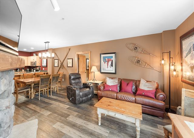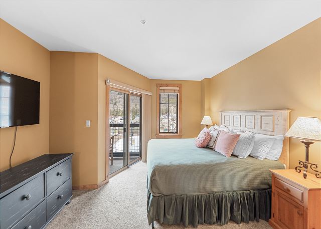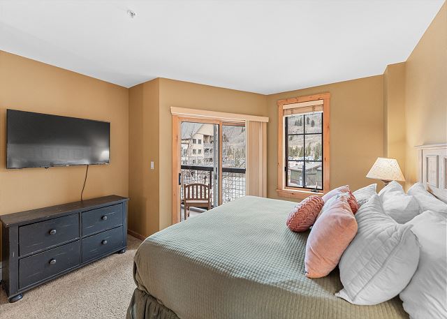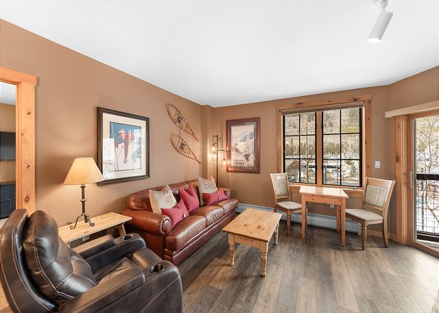 The entryway offers mounted hooks and a bench for your convenience while coming and going throughout the day. The living area features a stone gas fireplace, a flat screen TV and a queen-sized sleeper sofa. Extra linens are in a closet. There is a small two-person game table with an inlaid chessboard. The private balcony is just off of the living area and offers views of the Gore Mountain Range and overlooks Dercum Square that features an ice skating rink in winter and a putt-putt golf course in summer.