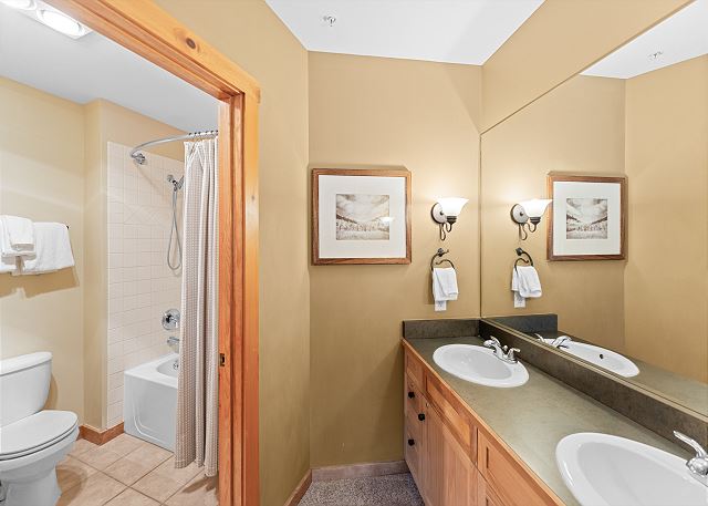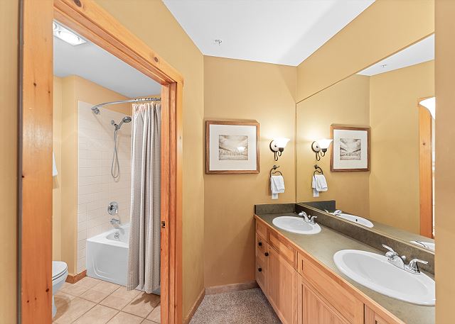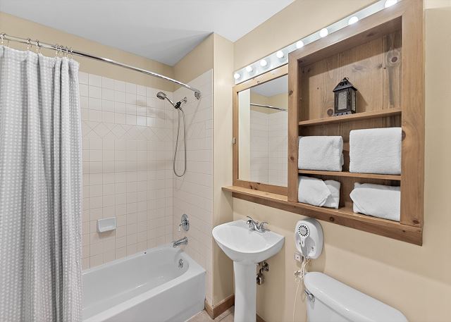 The full-sized kitchen is stocked with all the essential cookware and tableware to make a meal away from home and features stainless steel appliances. The dining area comfortably seats six people but with two additional leaves it can seat up to eight. Just off of the living area is the first of two full bathrooms and it has a shower/tub combination and a pedestal sink. All bathrooms are stocked with towels and an initial supply of toiletries.
