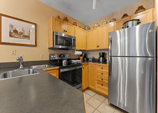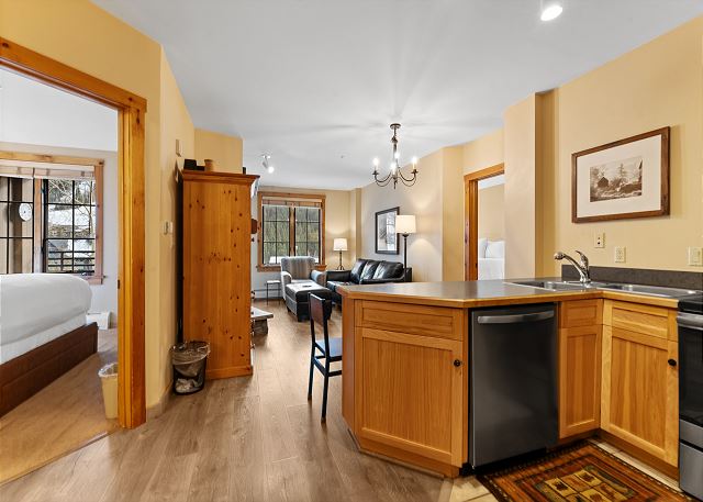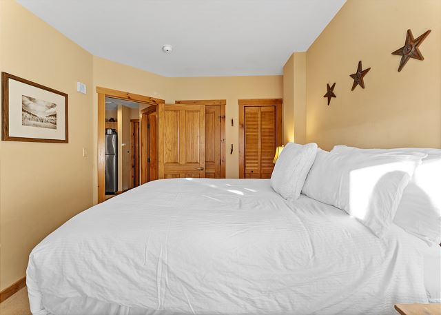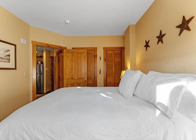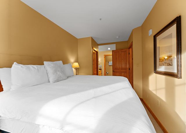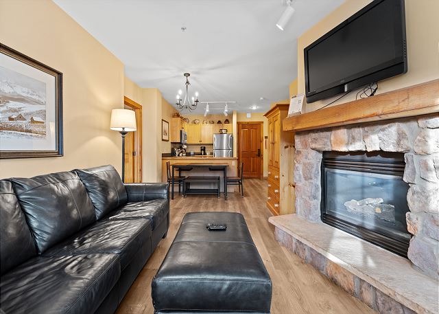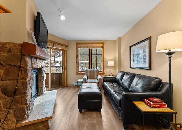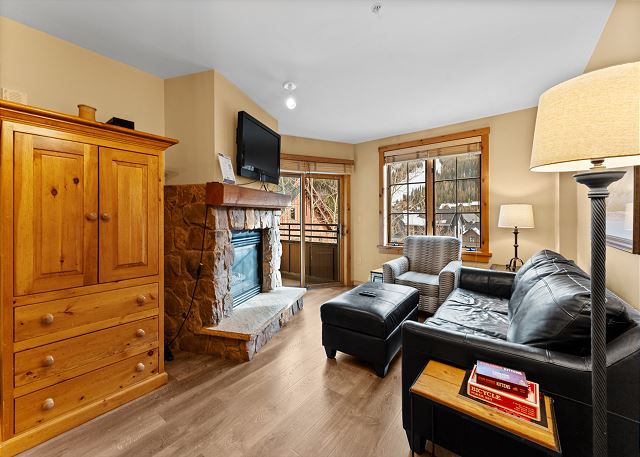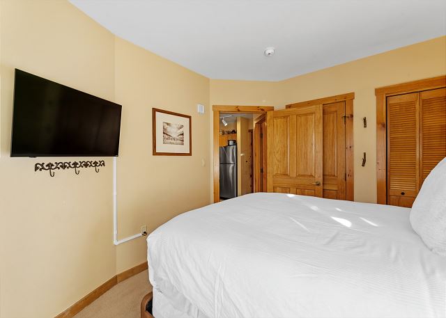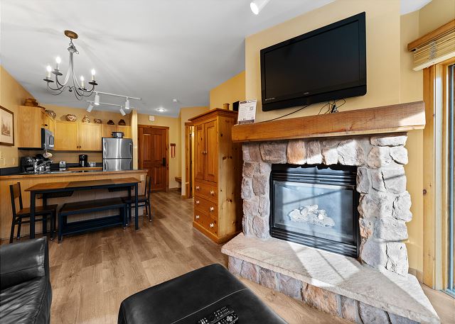 The entryway has mounted hooks and a bench for your convenience while coming and going throughout the day. The living area features a flat screen TV mounted above a stone gas fireplace and a queen-sized sleeper sofa. Extra linens are in a closet. The private balcony is just off of the living area and offers beautiful views of the main ski run. It also overlooks the pool and hot tubs making it easy to see if other guests are using them.