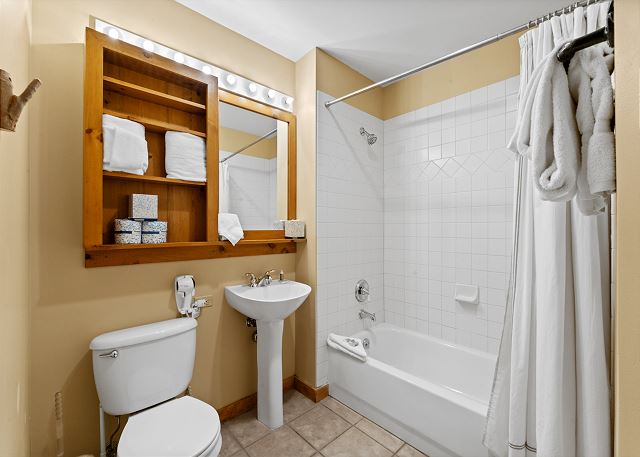 The full-sized kitchen is stocked with all the essential cookware and tableware to make a meal away from home. The dining area comfortably seats four and two additional chairs can be added. The first of two full bathrooms is just off of the living area and features a pedestal sink and shower/tub combination. All bathrooms are stocked with towels and an initial supply of toiletries.