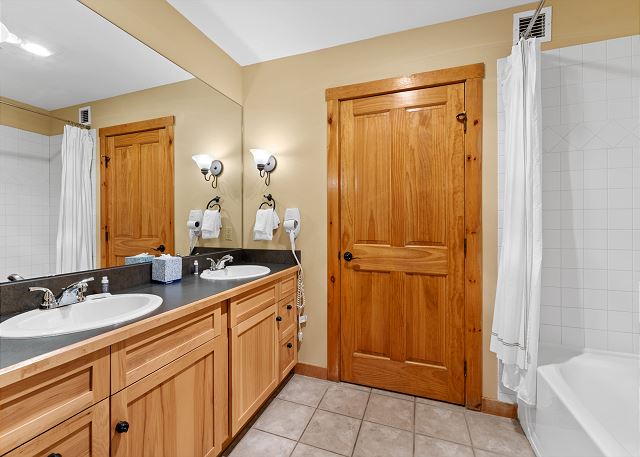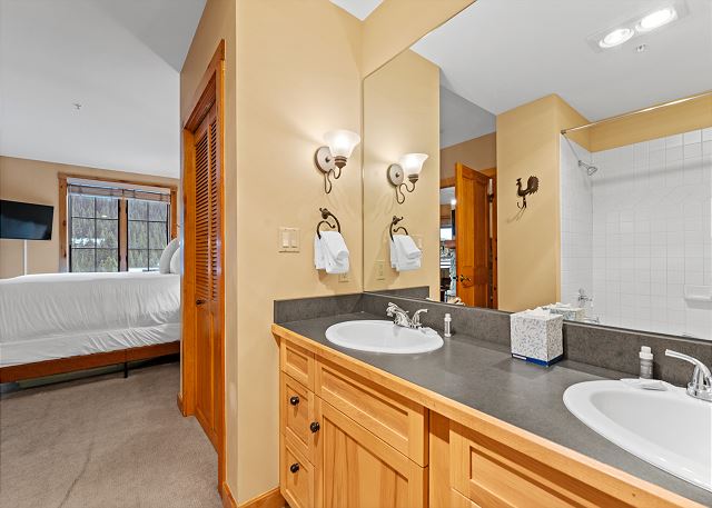 The primary suite features a king-sized bed, a flat screen TV and slope views. The en suite bathroom has double sinks, a shower/tub combination and a door separates the toilet area for added privacy. The guest bedroom has a queen-sized bed and a flat screen TV.
