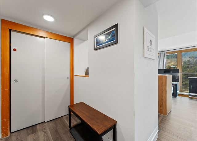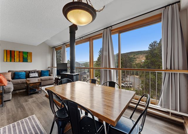 As you step into the unit, a bench, mounted hooks, and a storage closet await, providing convenience as you come and go throughout the day. Continuing beyond the entryway, you'll discover the open-concept living, dining, and kitchen areas. The living space boasts a large flat-screen HD TV, a cozy wood-burning fireplace, and a brand-new sectional that easily converts into a queen-sized bed for added sleeping options. Extra linens are neatly stored in a nearby closet. Enjoy breathtaking mountain views through the expansive windows and sliding doors, reminding you that you're truly immersed in the beauty of the Rocky Mountains.