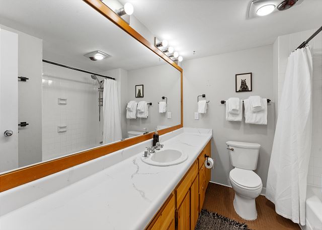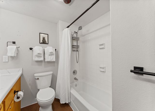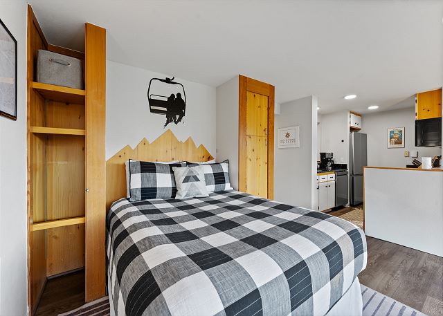 The full-sized kitchen is stocked with all the essential cookware and tableware to make a meal away from home and features modern stainless steel appliances. Adjacent to the living space, the dining area comfortably accommodates six guests. The full bathroom offers a spacious single-sink vanity, along with a shower and bathtub combination, complete with towels and initial toiletries. Settle into the recently upgraded queen-size bed tucked away in the far corner of the unit, promising a restful night's sleep. Though somewhat compact, this unit offers a cozy retreat to unwind and rest after a day of adventure, providing all the necessities and more for a comfortable stay.