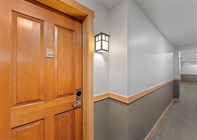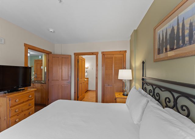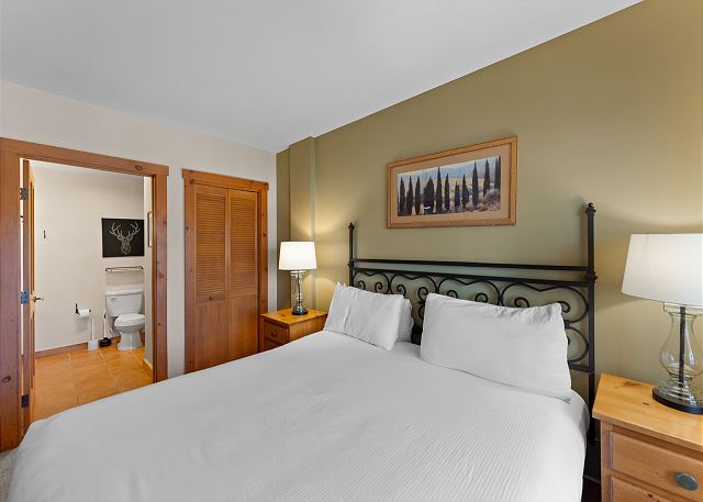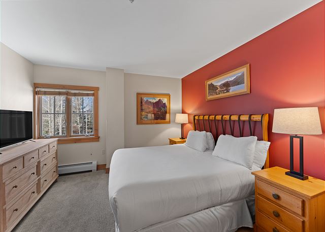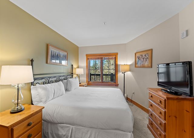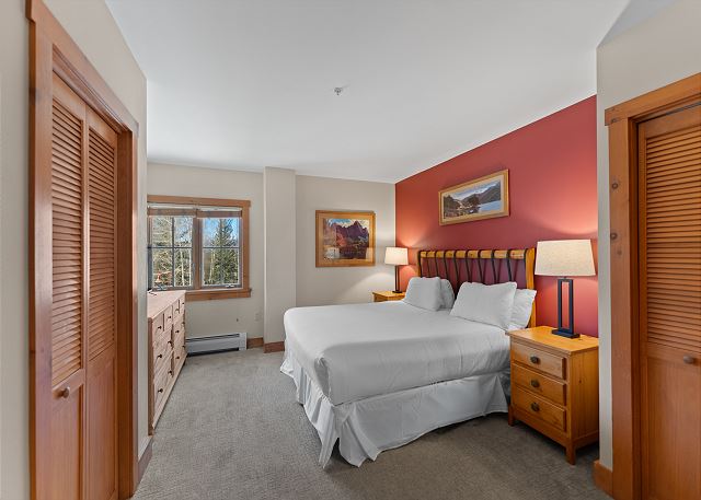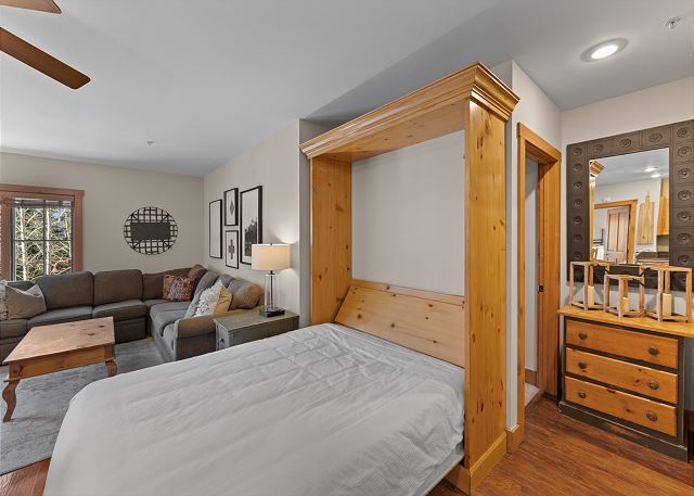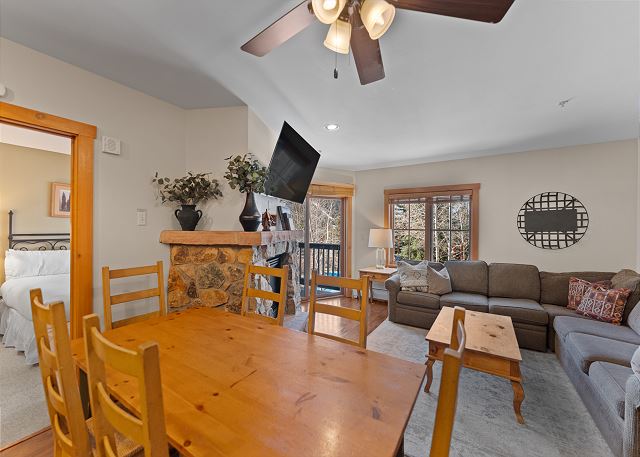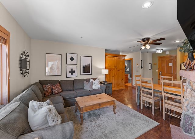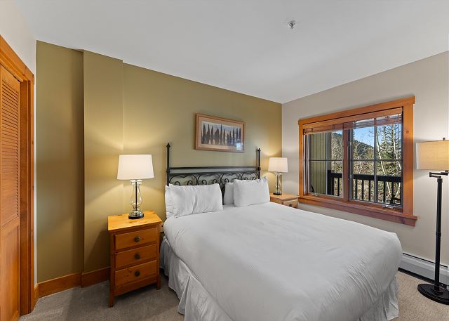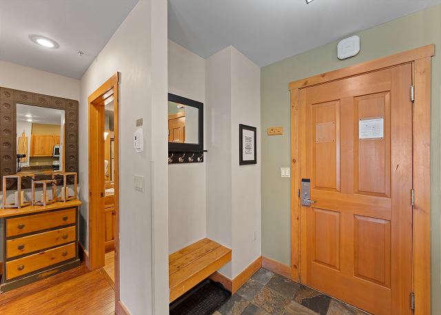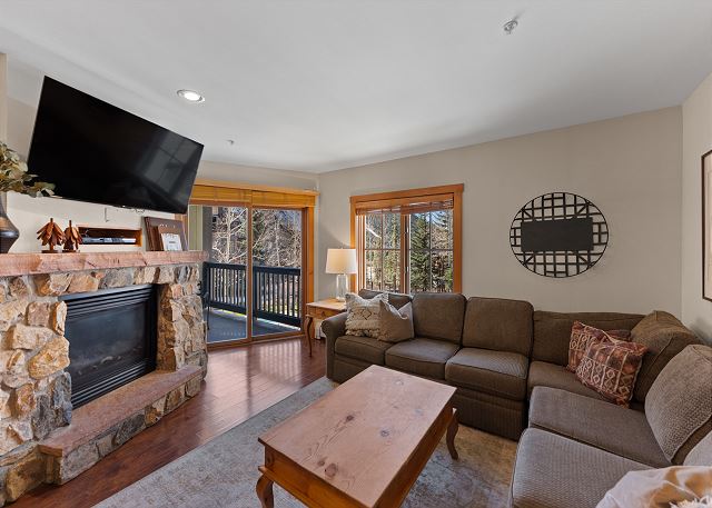 The entryway offers mounted hooks and a bench for your convenience while coming and going throughout the day. The living area features a flat screen TV mounted over a beautiful gas fireplace and a queen-sized sleeper sofa. Near the living area is a queen-sized sleeper chest. Additional sheets and blankets are in a closet. The private balcony can be accessed through the living area and overlooks the shared pool and hot tub with scenic mountain views.