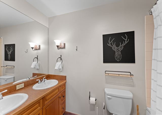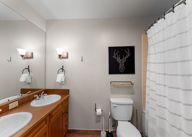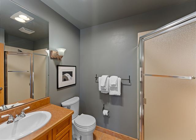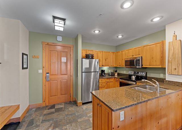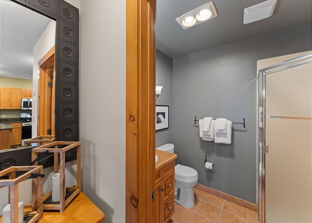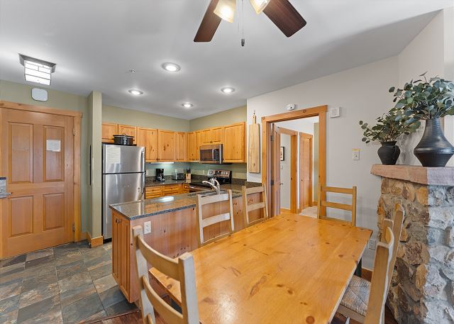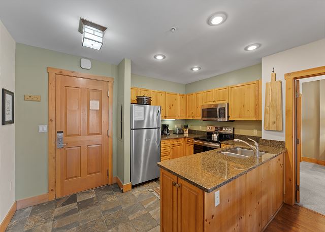 The full-sized kitchen is stocked with all the essential cookware and tableware to make a meal away from home. It features granite countertops, stainless steel appliances and slate floors. The kitchen also includes Keurig coffee maker, making it easy to brew a fresh cup of coffee anytime. The dining area comfortably seats six people. The guest bathroom is located just off of the living area and features a single sink vanity and a walk-in shower. All bathrooms are stocked with towels and an initial supply of toiletries.