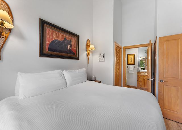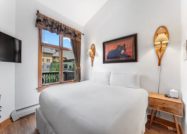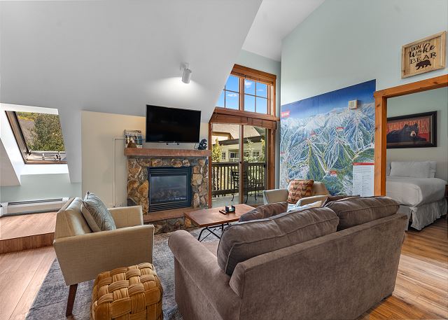 Ideal for families or small groups, this unit comfortably sleeps up to six guests across a spacious king bed in the primary bedroom, a queen-sized sleeper sofa, and a queen Murphy bed—both cleverly tucked into the open living area. Vaulted ceilings create an airy, lodge-like feel, while a cozy gas fireplace and large flat-screen TV provide the perfect spot to relax after a day on the mountain.