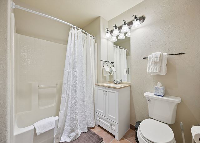 The first of two full bathrooms is located just off of the entry area and has a single sink vanity and a shower/tub combination. Both bathrooms are stocked with towels and an initial supply of toiletries.