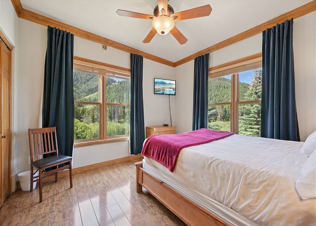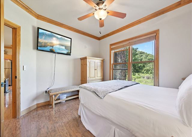 The primary bedroom features a queen-sized bed and a flat screen TV. The en suite bathroom has an updated double sink vanity and a walk-in shower. The guest bedroom offers a queen bed and a flat screen TV. Both bedrooms offer beautiful mountain views.