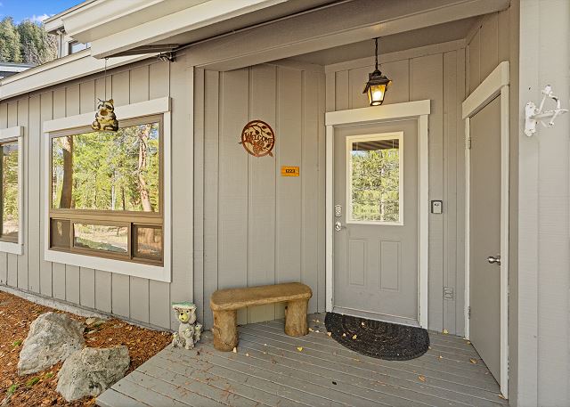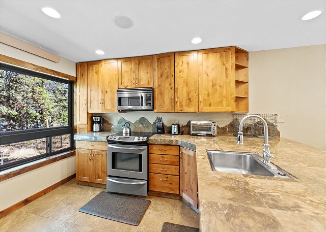 Near the entryway are mounted hooks and a bench for your convenience while coming and going throughout the day. The living area features a flat screen TV above a wood-burning fireplace with stone surround. Enjoy oversized, comfy furniture and the beautiful views through the large windows. From the living area, head out to the private patio to enjoy views of mature pines and fresh mountain air. Relax and enjoy he wood fire pit for viewing the spectacular scenery.
