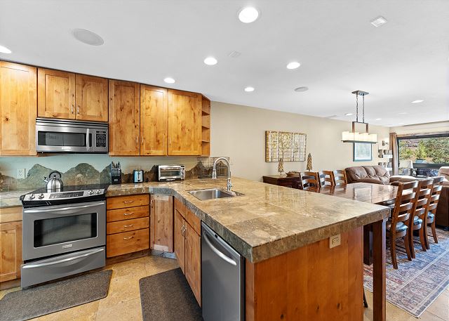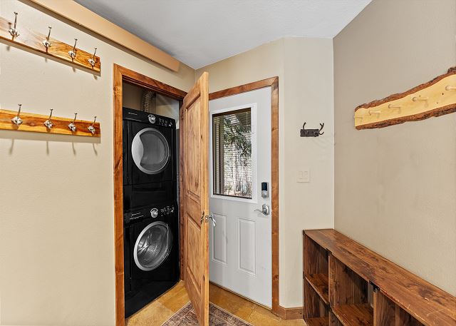 The full-sized kitchen is stocked with all the essential cookware and tableware to make a meal away from home and features granite countertops and stainless steel appliances. There's a three-person breakfast bar off the kitchen that has a wine cooler for your favorite beverages. A full dining area comfortably seats six. Back near the entryway is a private washer and dryer and laundry detergent is provided for your convenience.