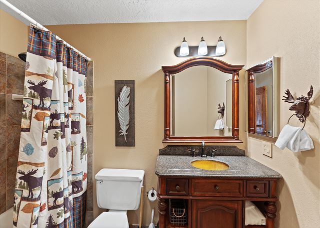 Upstairs are two guest bedrooms and a guest bathroom. The first guest bedroom features a king bed and workspace for working remotely. There's also a flat screen TV and beautiful views through the large windows. The second guest bedroom features a twin-over-full bunk bed and a flat screen TV. The guest bathroom has a single sink vanity and a shower/tub combination. All bathrooms are stocked with towels and an initial supply of toiletries.