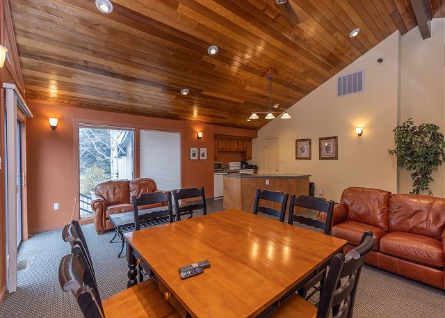 Inside, the living area features a cozy fireplace, flat-screen TV, comfy seating, and a queen Murphy bed for additional sleeping space. The open kitchen comes fully equipped with stainless steel appliances, and the dining table for 6 sits in front of large picture windows, perfect for enjoying meals with a view.