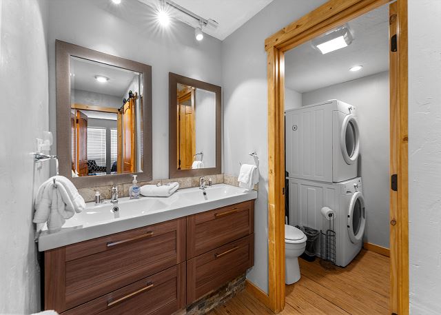 Down the hall, you'll find a spacious bedroom with a king bed, and a full bathroom with dual sink vanity, a walk-in shower, and a washer/dryer for your convenience.