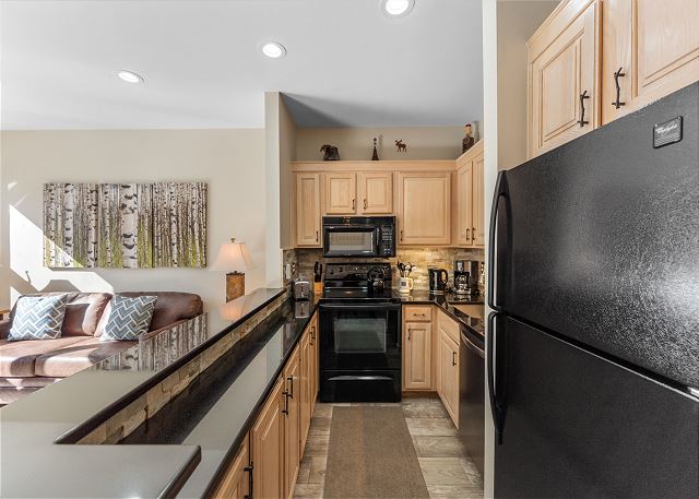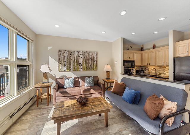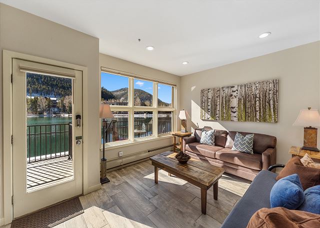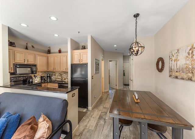 The living area features updated hardwood flooring, new furnishings, a flat screen TV next to a beautiful stacked stone gas fireplace, and a window offering beautiful mountain and lake views. Enjoy game night with the whole family with board games for guest use. There is a luxury futon and a queen sleeper sofa for extra sleeping arrangements in the living area. Extra sheets and blankets are in a closet. The private patio is just off the living area and provides guests walk-out access to Keystone Lake.