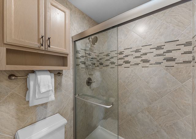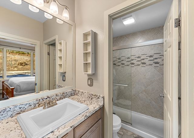 The bedroom features a king-sized bed with Ivory White Bedding and a flat screen TV. There is ample space for storing personal items in the closet and dresser found in the master. The bedroom also has its own entrance to the guest bathroom. There is a folding crib for families traveling with babies in the closet. The full bathroom features granite counter tops, brand new flooring. A door separates the shower/tub combination and toilet area for added privacy. It is stocked with towels and an initial supply of toiletries.
