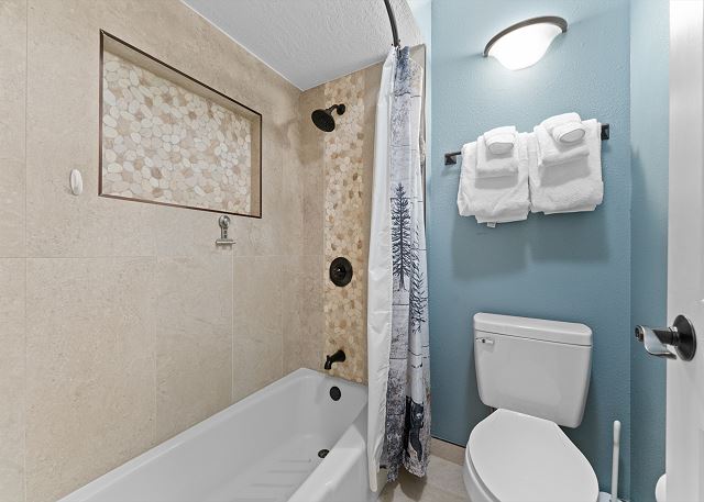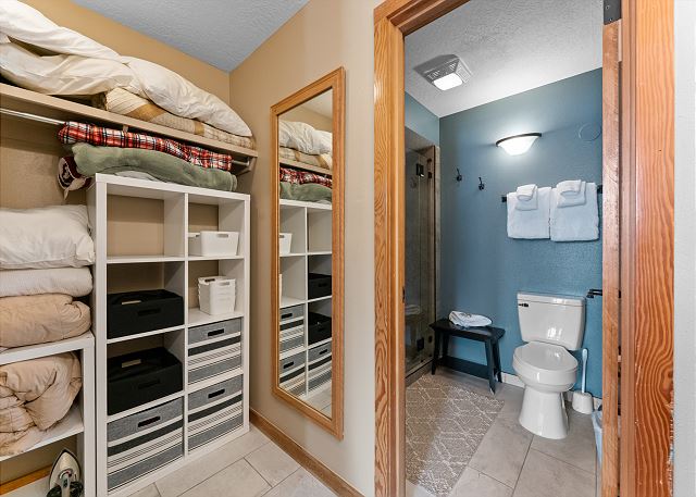 The guest bathroom, located off the main hallway, includes a shower/tub combination. The primary bedroom features a king bed, television, workspace, and an en suite bathroom with dual-sink vanity, walk-in shower, and a spacious closet stocked with additional pillows and blankets. The guest bedroom is well-suited for children or additional guests, offering a twin bunk bed and a separate twin bed.