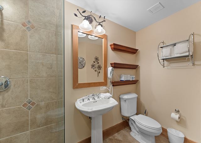 A guest bathroom off the main living area offers a walk-in shower with dual showerheads for added comfort. A private washer and dryer are conveniently located in the entry closet.