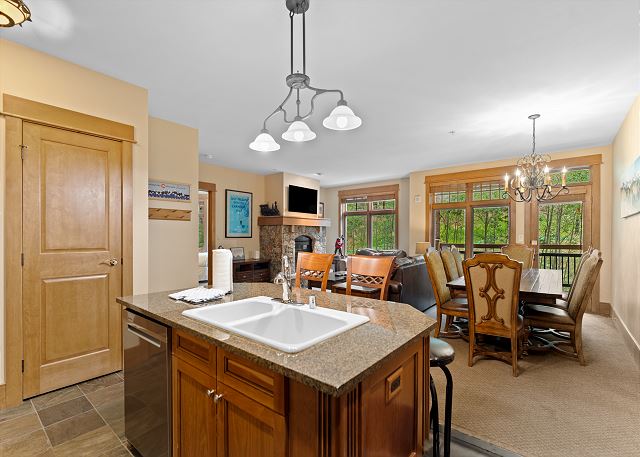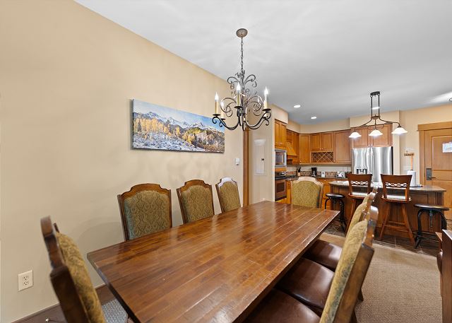 The fully equipped kitchen includes stainless steel appliances, cookware, dinnerware, and a breakfast bar with seating for four. The adjacent dining area comfortably seats up to eight, making it ideal for both casual meals and special dinners.