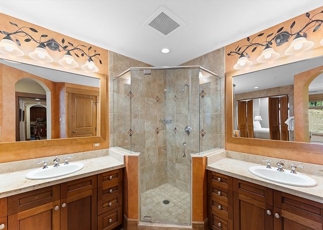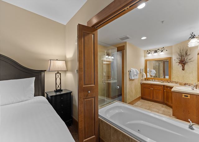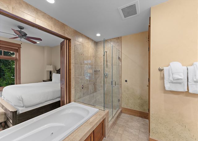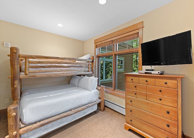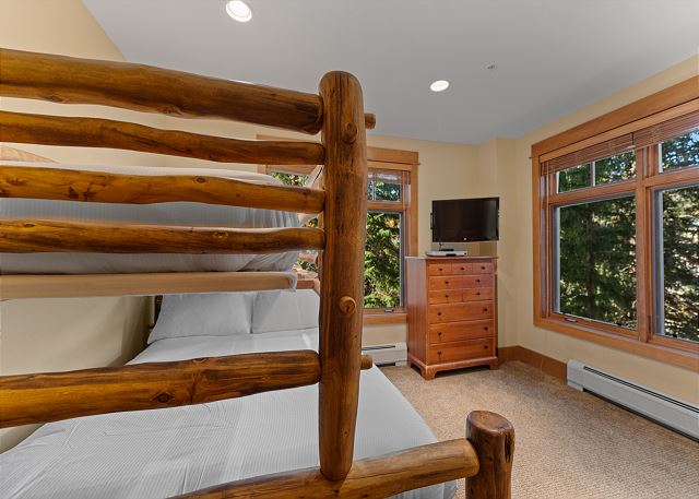 Sleeping arrangements are thoughtfully appointed for comfort and privacy. The primary and secondary bedrooms each feature a luxurious king bed, flat-screen TV, and en suite bathrooms complete with jetted tubs and separate walk-in showers—perfect for soaking tired muscles. The first bunk room includes a twin-over-queen bunk bed and a private en suite bathroom, while the second bunk room also offers a twin-over-queen bunk and a mounted TV. An additional full guest bathroom with a walk-in shower is conveniently located off the main hallway.