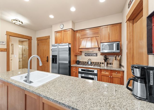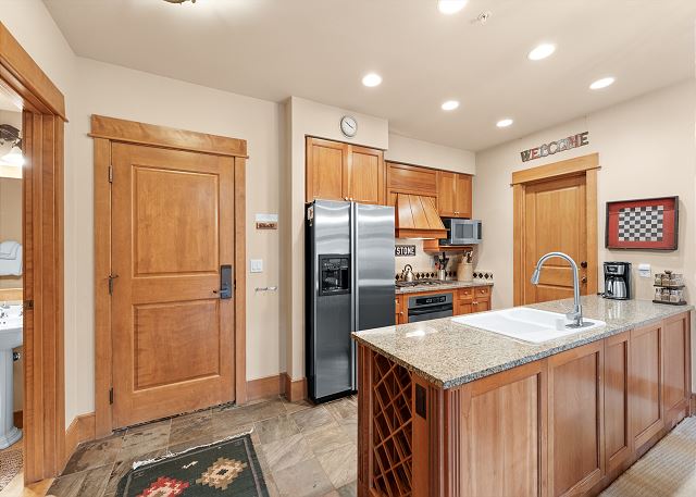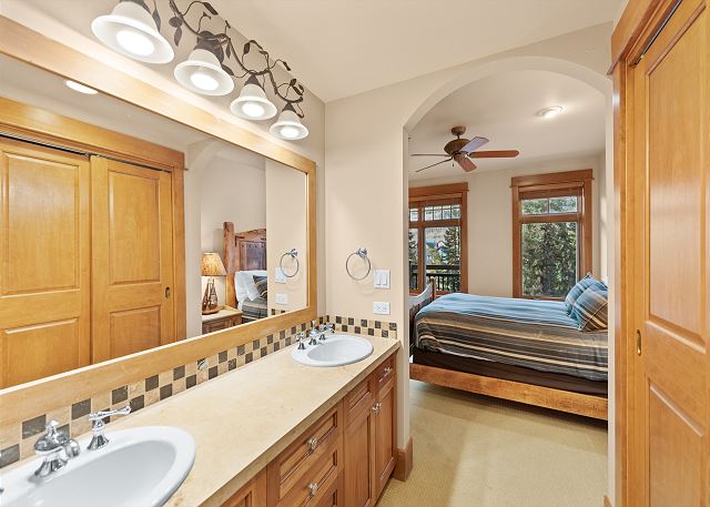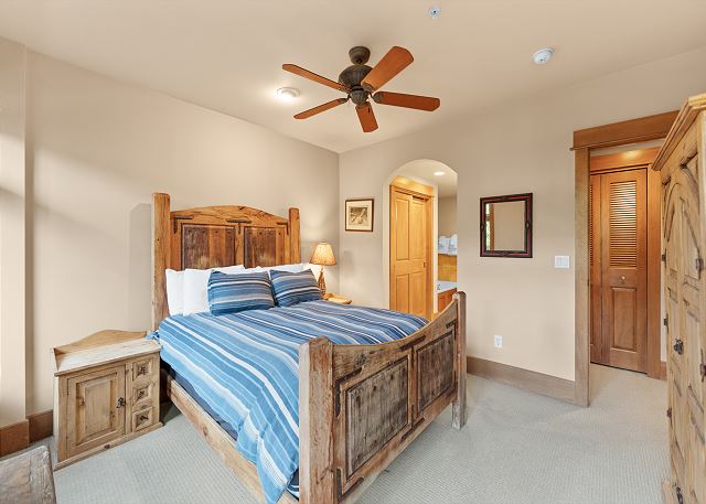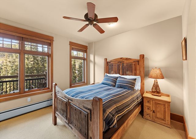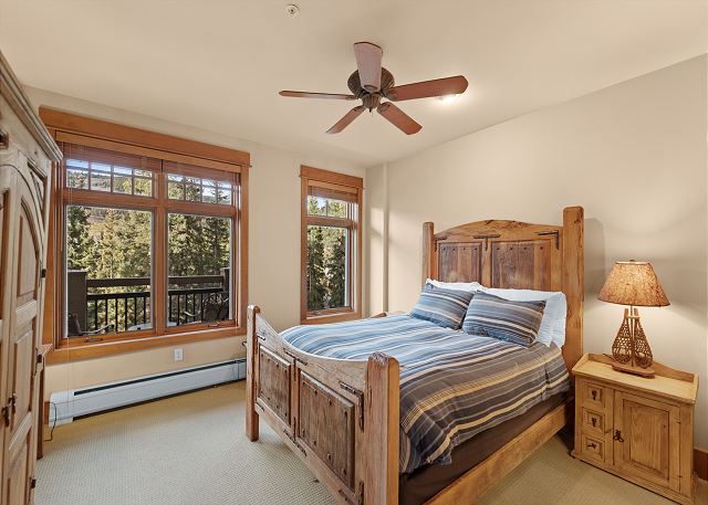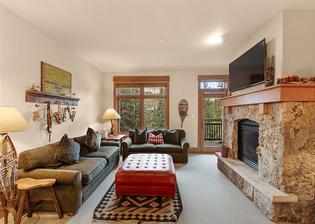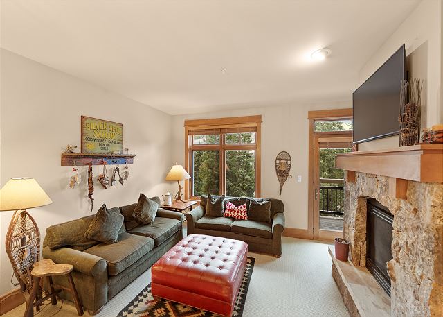 The entryway offers mounted hooks a bench for your convenience while coming and going throughout the day. The living area features a flat screen TV mounted above a beautiful stone gas fireplace and cozy furniture. There is a queen-sized sleeper sofa and extra sheets and blankets are in a closet. The private balcony is just off the living area and features tall pines and mountains in the distance. Enjoy the sounds of Snake River in the spring, summer and fall.